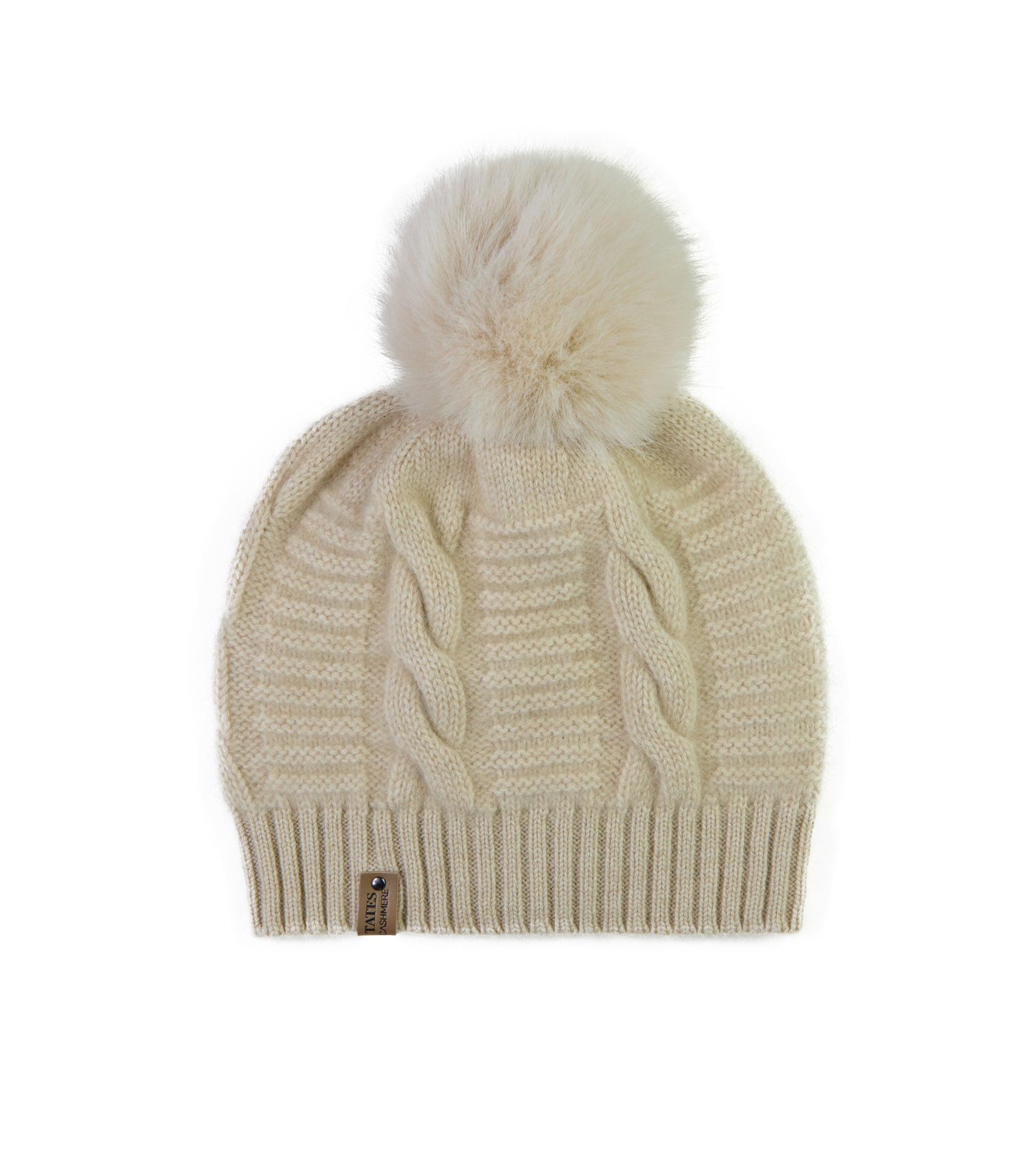A lovely knitted cashmere Pom Pom hat for colder season. Made from 100% Mongolian cashmere. Shown here beige, comes in teal, taupe, brown, black and grey.