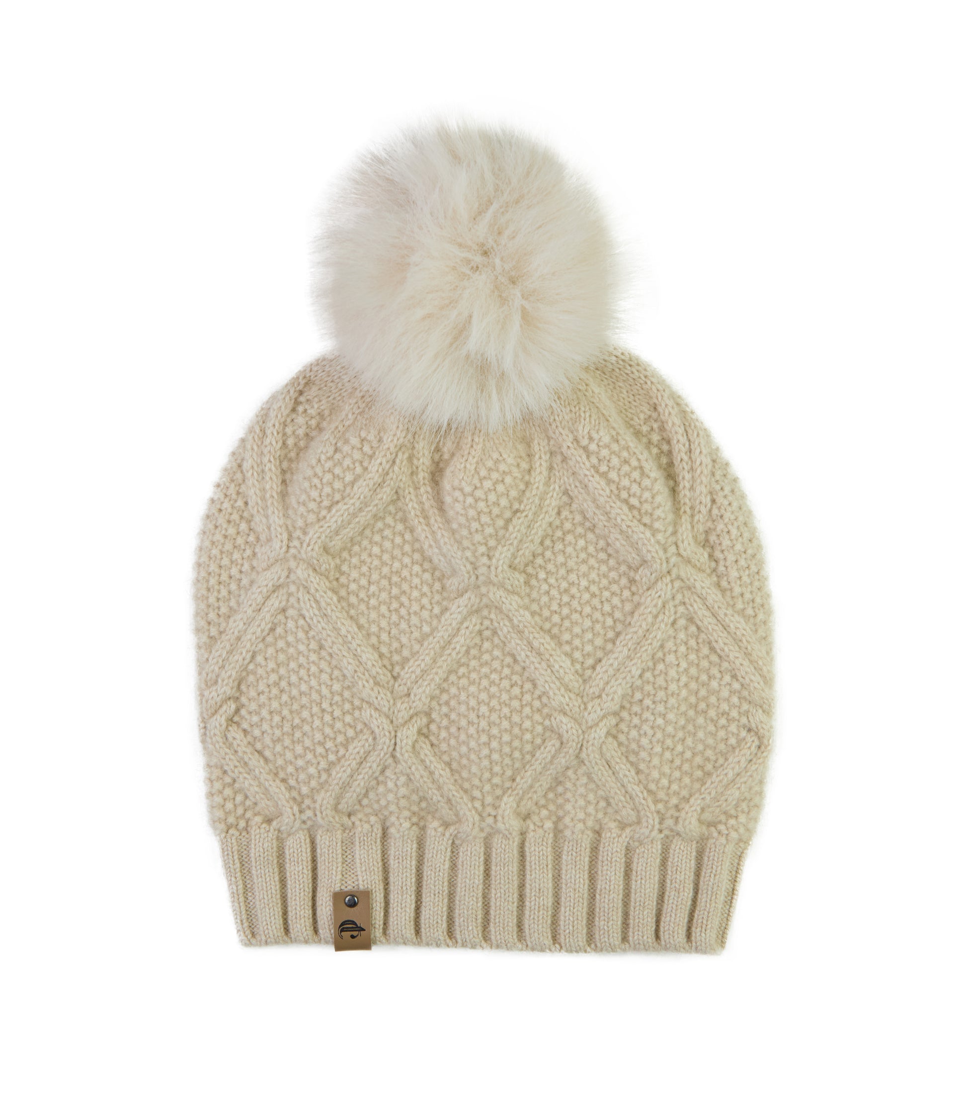 A lovely knitted Pom Pom hat. Made from 100% Mongolian cashmere. Shown here in beige, comes in black, grey and taupe.