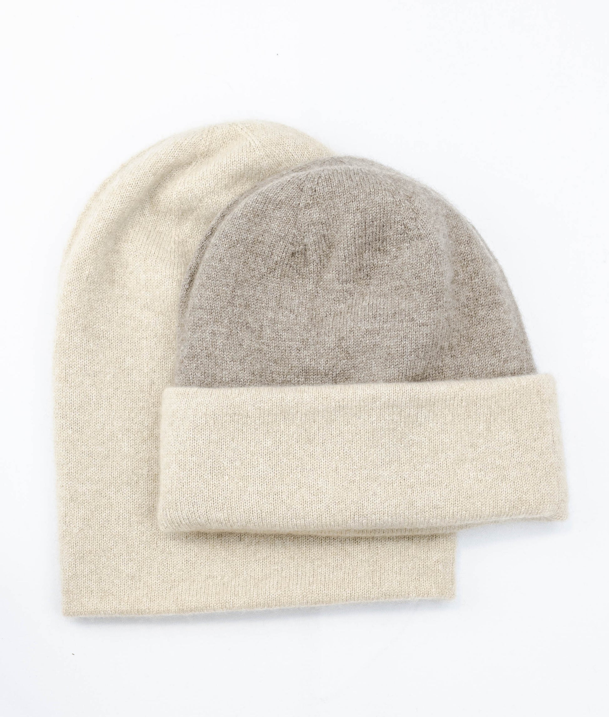 Made from the finest quality Mongolian 100% cashmere. This is beanie double layered reversible hat is a wardrobe favourite for many. Would make a perfect gift for someone special. Shows here beige. Choice of beige and taupe contrast.